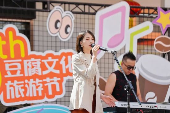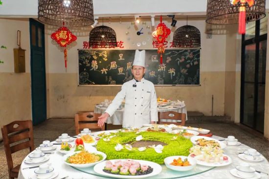 百张餐桌沿街铺开,食客举筷品尝热腾腾的豆腐羹、臭豆腐煮牛肉;厨师现场点卤、压豆腐。