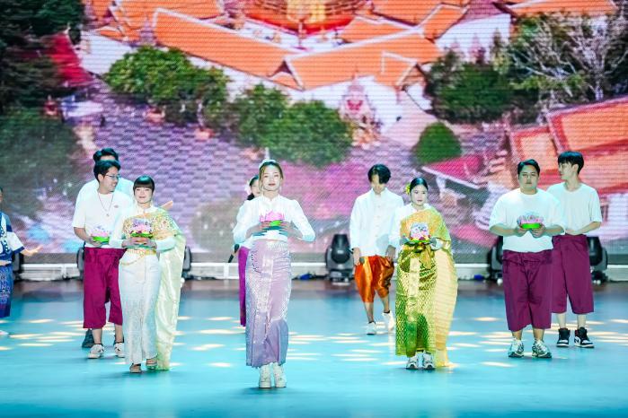 紧接着,老挝舞蹈《欢舞少年郎》、孟加拉歌伴舞《孟加拉欢歌》、尼泊尔民族舞《热情尼泊尔》、巴基斯坦《丝路新跃》、蒙古舞蹈《托林胡尔》、越南歌伴舞《我的越南》、泰国舞蹈《烛光守夏》、中国舞蹈《稻浪间的振兴欢歌》、街舞《that that》、话剧《边民互市》、朗诵+合唱《夜空中最亮的星》、中外师生合唱《花开中国》充分展现了不同国家和民族的文化特色与风情,演出最终在中外学子共同演绎的串烧歌曲《炫动中华》的激昂旋律中圆满落幕。