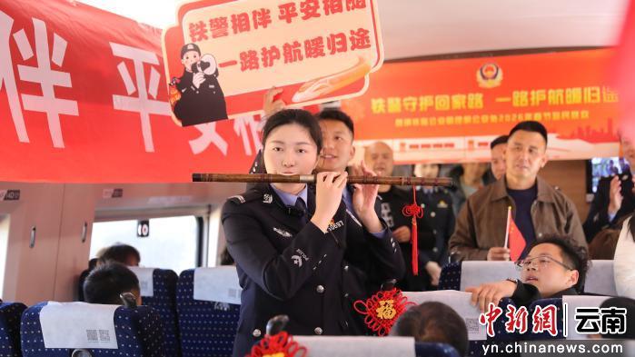 喧闹忽被清越旋律抚平。民警张洋葫芦丝与巴乌轮番奏响《弥渡山歌》《打跳欢歌》《阿瓦人民唱新歌》《竹楼情歌》。婉转的乐声在车厢流淌,列车仿佛放慢了脚步,窗外的片片山峦化作青山绿水与傣家竹楼。曲终,短暂静谧后,掌声经久不息。