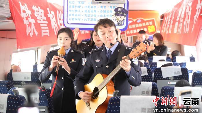 随后,反诈宣传骨干谢乙生主持的有奖问答,紧扣节目内容,围绕机票退改签与反诈知识展开,旅客们踊跃举手,在欢笑中巩固安全常识。紧接着,吉他伴奏响起,一首云南方言反诈山歌将“冒充客服”“共享屏幕”等骗局编成故事,一句“哦豁豁——钱就划得喽!”引得满车厢笑声不断。