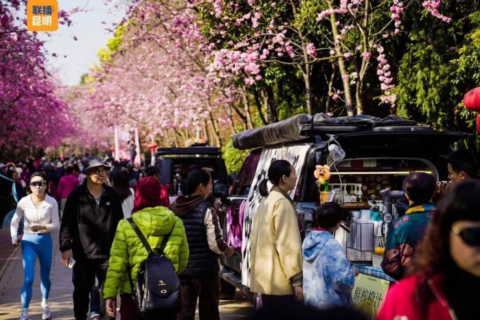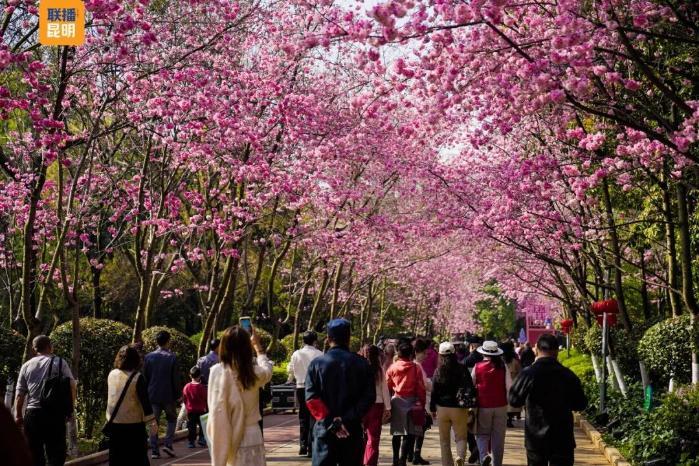 主办方介绍,在为期一个月时间,主舞台化身为全民共享的“百姓开放舞台”。“乡情大舞台”将邀请本地优秀文艺团队带来花灯、歌舞等表演;“樱潮·卡拉永远OK”派对则邀请市民游客在夜樱下齐声欢唱,尽情舞动,感受春日夜晚的激情与浪漫。而这一全民共享的舞台设计,正是对昆明市“春风十里昆明有你”主题活动的生动呼应——让每一位普通市民都能成为城市文化的主角,在樱花树下绽放属于自己的光彩。