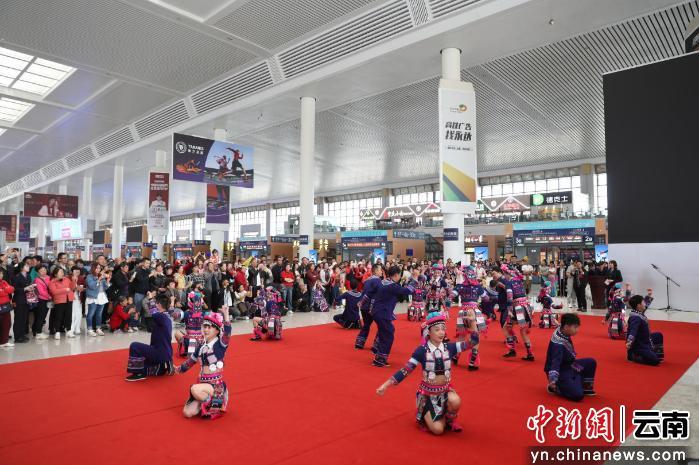 中新网云南新闻3月27日电 (殷学合 韩富关)在“第二十届墨江北回归线国际双胞胎节”即将来临之际,“坐着火车游云南 遇见墨江·好事成双”系列活动近日在云南昆明正式拉开帷幕。此次活动通过新闻发布会、在昆明南站候车大厅以及昆明至墨江列车上开展“遇见墨江·好事成双”主题文化活动等,以极具民族特色的打跳、精彩纷呈的民族歌舞表演,为旅客们呈上了一场绚丽多彩的视听盛宴,同时向中外宾客发出诚挚邀约,邀请大家坐着火车畅游云南。