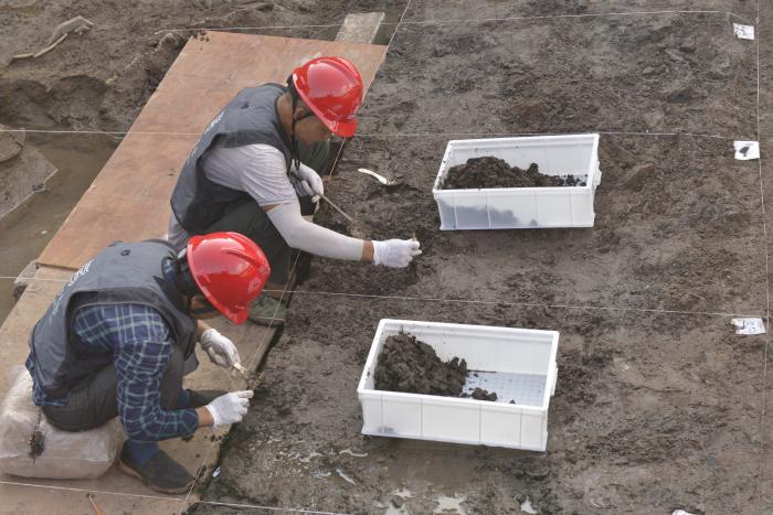 在河泊所遗址考古发掘现场,一幅有序而专注的图景徐徐展开:考古人员或俯身细致清理探方,或操作摆臂吊将土样运出,以便后续水洗筛选——每一铲土、每一片陶,都可能蕴藏着两千年前的密码。
