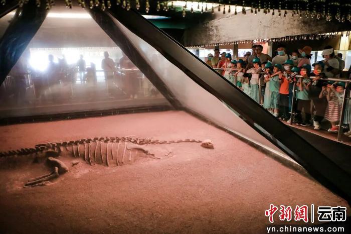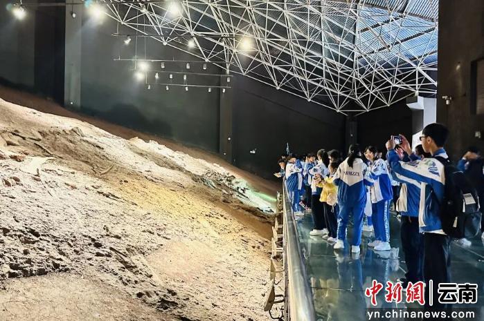 在恐龙遗址公园,孩子们走进世界级的“禄丰恐龙大遗址”展馆,近距离观察中国第一具完整的恐龙化石标本——“许氏禄丰龙”,聆听讲解员讲述恐龙从诞生到灭绝的演化故事。站在巨大的化石剖面面前,亿万年时光仿佛触手可及。