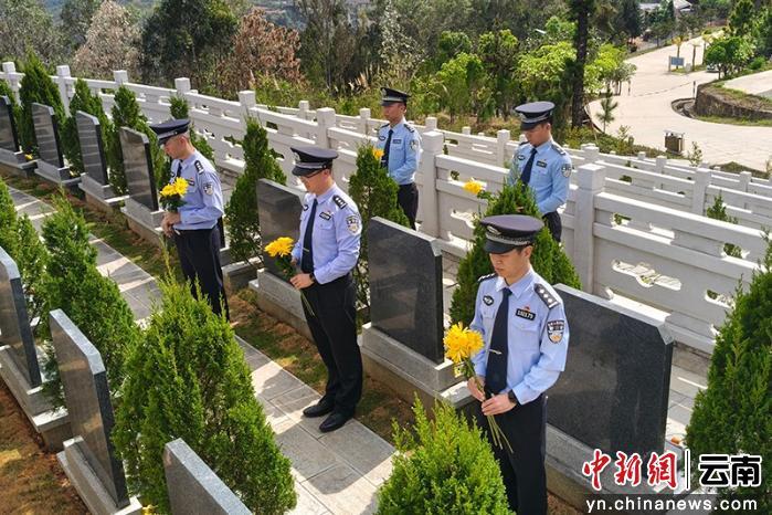 当日下午14时,在开远市三台寺烈士陵园,开远铁路公安处青年民警手捧菊花,缓步登上台阶,来到英烈的墓碑前,拂去碑角的尘土,郑重献上鲜花。松柏低语,时空静默。