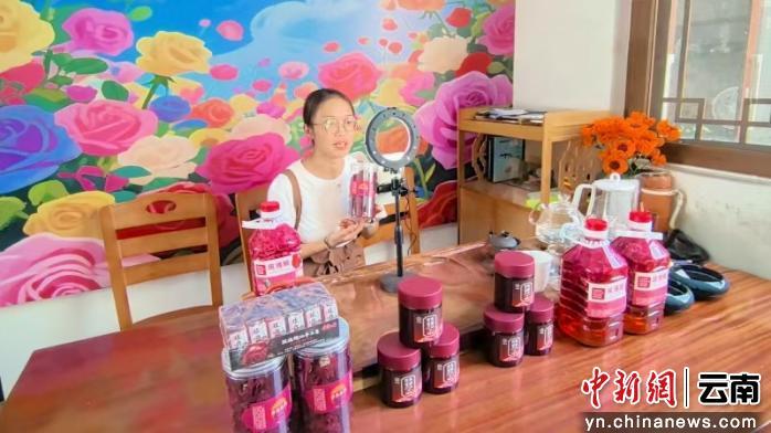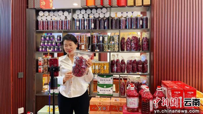 “大家请看,这是我们小河边的墨红玫瑰花茶。”零售户杨翠芳的女儿蒋金娥正在装饰一新的玫瑰主题店铺里,通过直播热情推介当地的墨红玫瑰。