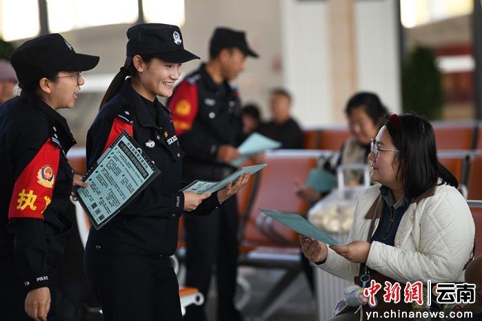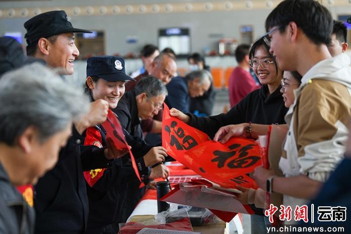 中新网云南新闻2月2日电(毕新来 杜威)2月2日,2026年春运正式拉开帷幕。清晨8点,弥蒙高铁上的开远南火车站,寒风中人流涌动,旅客们带着行李匆匆赶车。候车室内,开远铁路公安处开远南站派出所的民警们早已摆好长桌,铺开红纸,研好浓墨——一场以“平安春运,福满旅途”为主题的送福活动随之开始。