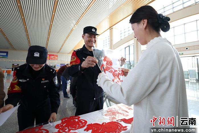“充电宝额定能量超过多少不能带上车?”“身份证丢失如何快速进站……”民警们设置了“安全知识有奖问答”环节,答对的旅客可获得春联或剪纸窗花。
