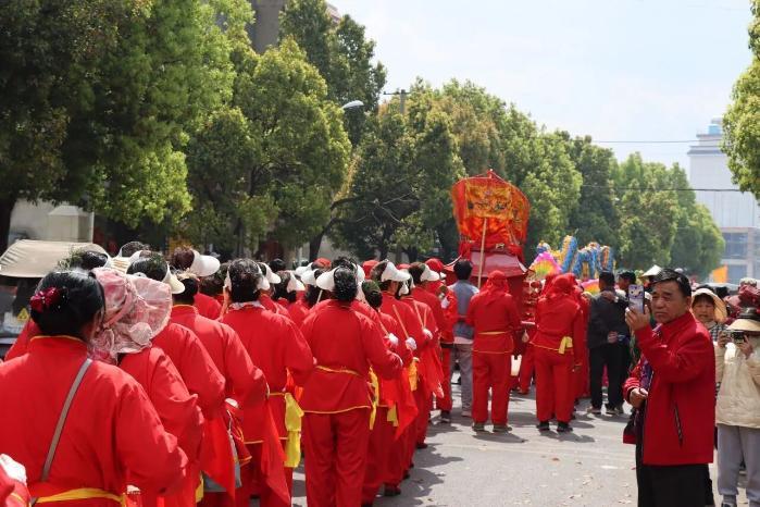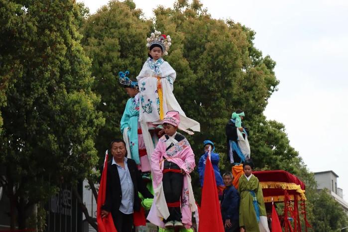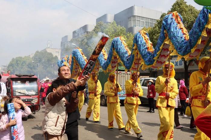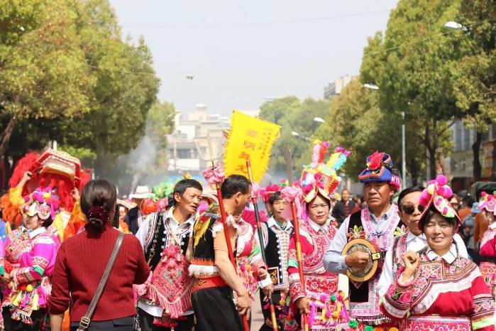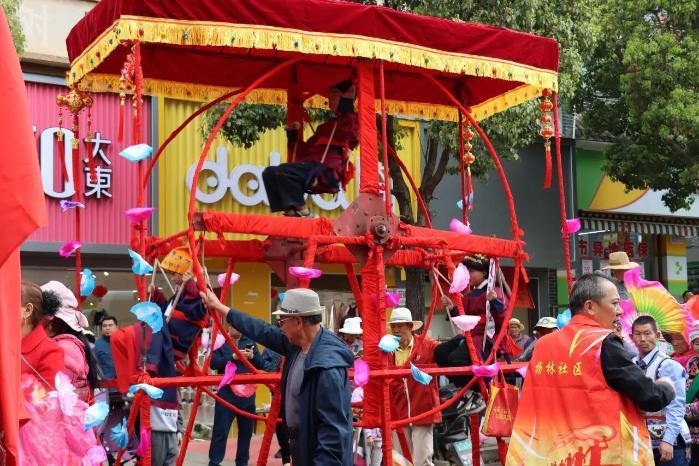 当天,来自四面八方的各类民俗表演队伍已早早等在街头,以锣鼓声拉开了大典的序幕。天秋表演、铁管表演、耍狮舞龙、花灯歌舞、左脚舞等节目巡游过兰茂路、东玉街、南街、水官街等多条老街,商户们沿路点燃鞭炮相送,群众们也盛装打扮,扶老携幼,一路欢声笑语跟随。