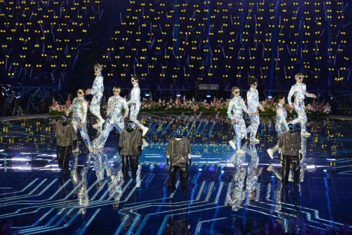 滇风盛典晚会上,有传统的歌舞表演与新潮的说唱、乐队演绎相融,也有本土的民族风情与现代的舞台科技碰撞。比如,昆明宇森科技的机器人登上舞台,与裕能、立讯、杉杉、云天化4家企业的一线职工代表共同演绎《开干!春城造》,让科技与文艺相融。
