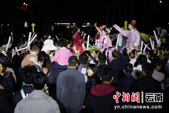 焰火落幕,狂欢不歇。在四位花神NPC等打跳队伍和音乐的带领下,广场瞬间变身欢乐的海洋。全场观众及演员共同打跳互动,跟随云南本土音乐尽情舞动。欢声笑语回荡在兰茂广场的夜空,将元宵的喜庆氛围推向极致。